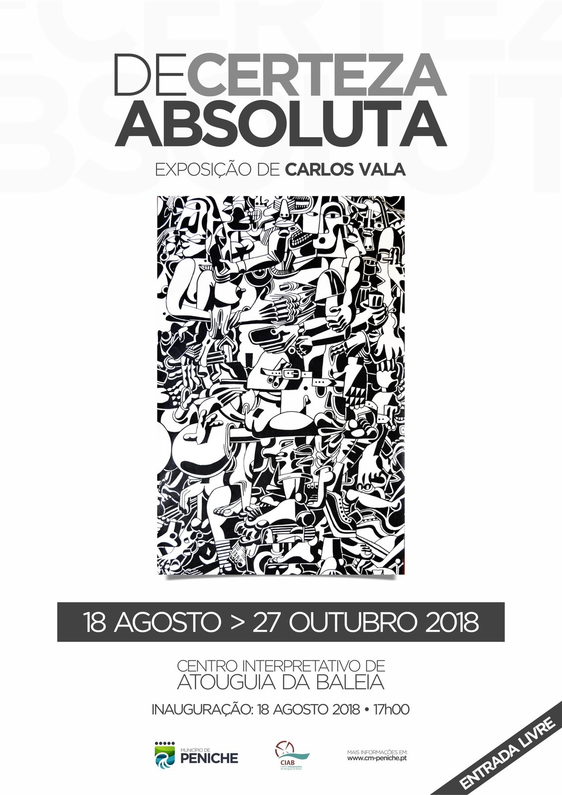 A exposição surge de um convite, do Centro Interpretativo da Atouguia da Baleia, que o artista viu como uma oportunidade para trazer à luz alguns dos seus últimos trabalhos. Enquanto muitas das obras que vai recorrentemente fazendo podem ou não vir a ser apresentadas a público, estas serão com toda a certeza, ou “De Certeza Absoluta” como indica o próprio título da exposição. Assim, o artista seleciona alguns dos trabalhos que tem vindo a fazer ao longo do tempo e trá-los a público com a certeza de que estes serão partilhados com os seus conterrâneos e outros visitantes do Centro Interpretativo de Atouguia da Baleia. Na verdade esta exposição é uma ocasião para mostrar o trabalho do artista para além das suas obras no Concelho e do seu trabalho de formação. Nesta exposição o artista apresenta telas e trabalhos em papel, pela importância que o desenho e o ato de “riscar” têm para o seu percurso artístico. Tal como se indica na biografia, o artista seguirá aquela que se pode afirmar ser a sua linha orientadora, a que se pode frequentemente ver presente nos seus trabalhos: a figura humana nos seus processos de metamorfose, sem limitações. As obras são, em geral, multifacetadas, com fragmentos de corpos desdobrados em construções e/ou camadas.