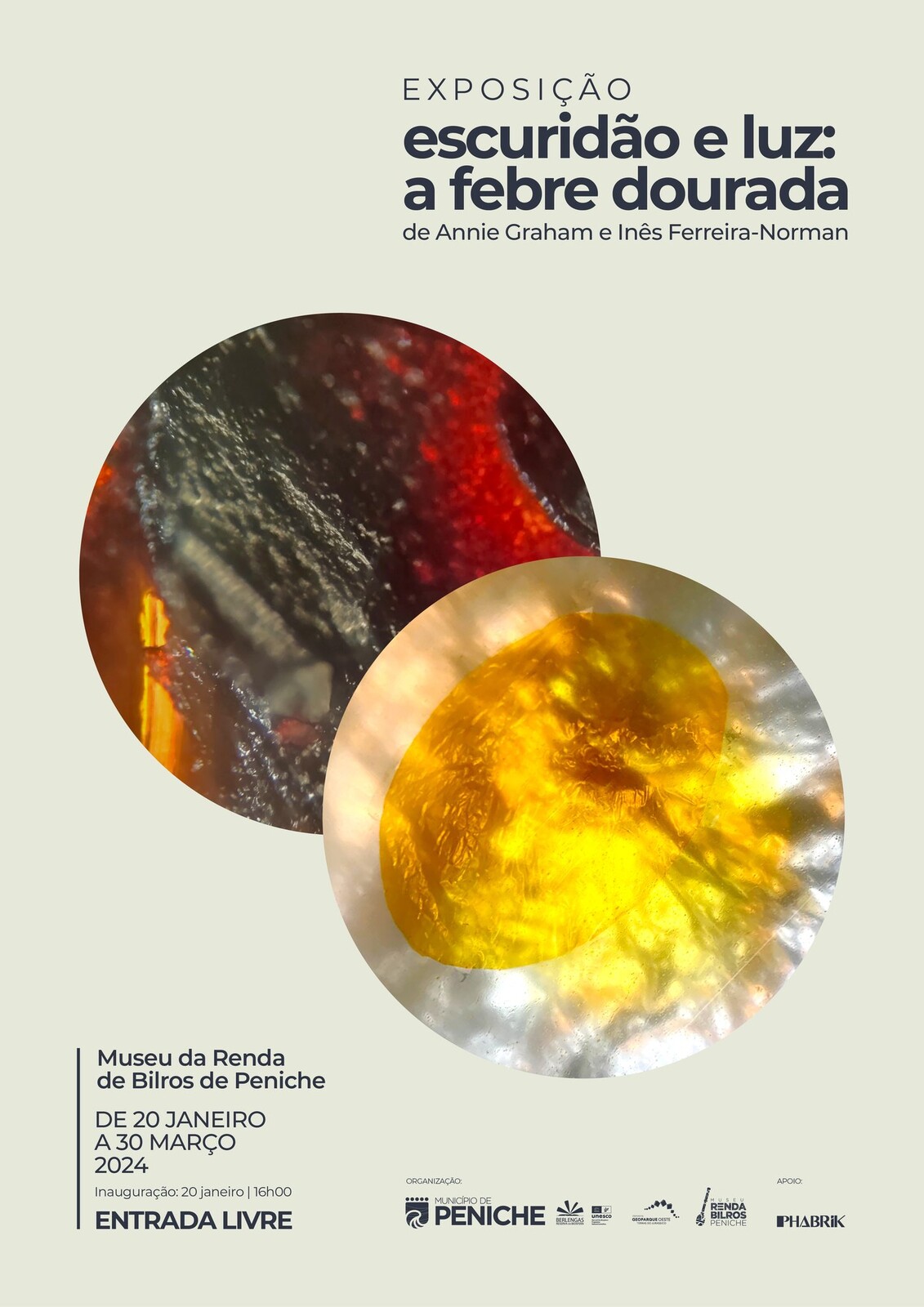 "Escuridão e Luz, a Febre Dourada" permite, de acordo com as artistas, reflexões sobre algumas das grandes questões da contemporaneidade. Annie Graham e Inês Ferreira-Norman mostram todo o seu deslumbramento por estes metais preciosos e partilham-no simbolicamente através das suas criações que ficarão expostas ao público no Museu da Renda de Bilros de Peniche até 30 de março de 2024.