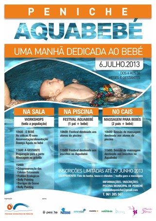 As Piscinas Municipais de Peniche dedicam a manhã do próximo dia 06 de julho de 2013 ao Bebé. Esta atividade está destinada a Bebés dos 6 aos 36 meses e gestantes, sendo as inscrições limitadas até 04 de julho de 2013.