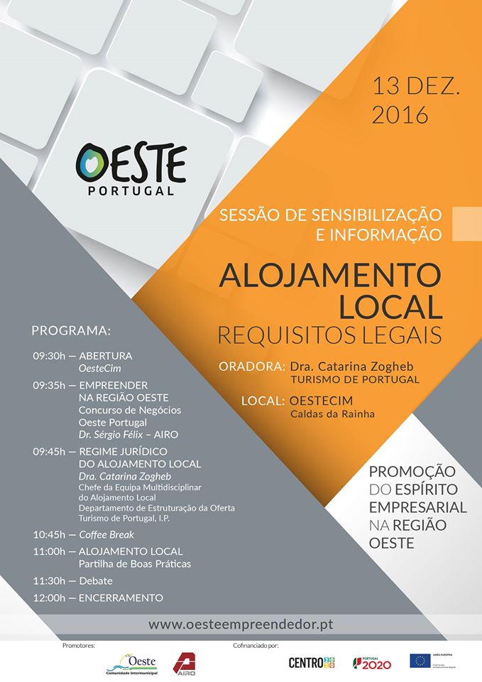 No próximo dia 13 de dezembro, a OesteCIM e a AIRO vão organizar uma sessão de sensibilização e informação denominada Alojamento Local: Requisitos Legais, que contará com a presença da Dra. Catarina Zogheb, em representação do Turismo de Portugal, na qualidade de Chefe da Equipa Multidisciplinar do Alojamento Local.