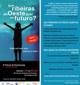 No próximo dia 16 de Março de 2011 terá lugar o 2º Fórum de Participação Pública no âmbito do Plano das Bacias Hidrográficas das Ribeiras do Oeste (PBHRO), que se encontra em fase de elaboração.