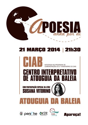 Será nesse dia, uma sexta-feira, que teremos a próxima sessão d’ A poesia anda por aí, com a colaboração de alguns dos habituais dizedores e a participação especial da atriz Susana Vitorino. Susana Vitorino já fez teatro, cinema e televisão -destacando-se as mais recentes participações na telenovela Dancing Days e na série Liberdade 21- e é uma das atrizes envolvidas no espectáculo Concerto Poético “Ser Portugal”.