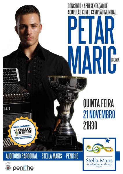 A Academia de Música “Stella Maris” – Peniche, com o apoio da Câmara Municipal de Peniche, tem o prazer de anunciar um Concerto de Acordeão, com o tri-campeão mundial, Petar Maric (Sérvia), no Auditório Paroquial-Stella Maris-Peniche, quinta feira, dia 21 de Novembro, pelas 21:30 horas. Inserido na campanha de angariação de fundos para instrumentos musicais novos, as entradas terão um valor simbólico de 1€.
