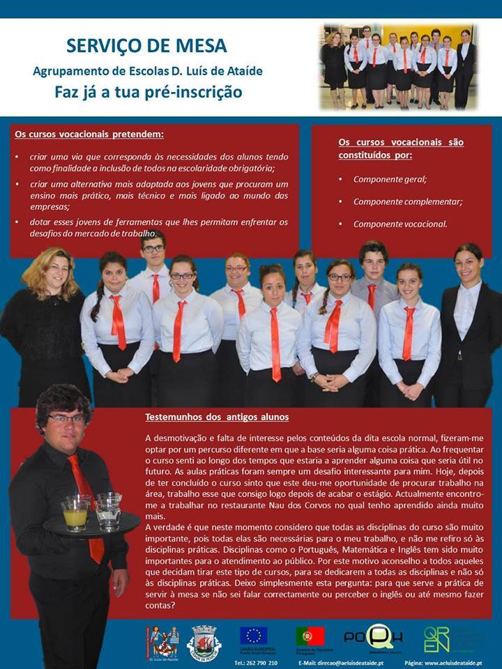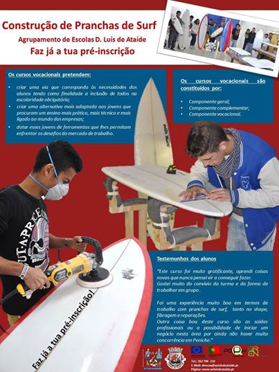 O Agrupamento de Escolas D. Luis de Ataíde tem neste momento abertas as pré-inscrições para dois cursos vocacionais, para conclusão do 9º ano, nas seguintes áreas: Construção de pranchas de surf e Serviço de mesa.