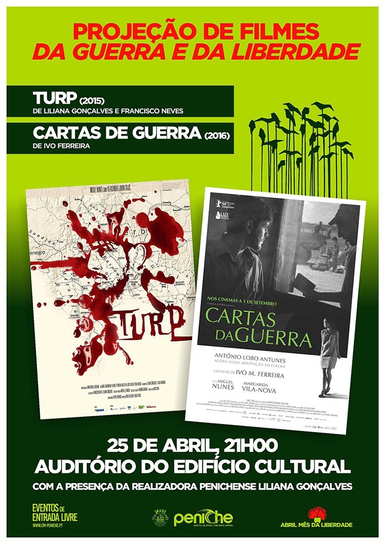 No próximo dia 25 abril, pelas 21h00, no Auditório do Edifício Cultural da Câmara Municipal de Peniche, terá lugar a projeção de dois filmes: a curta-metragem “TURP” (2015), da Liliana Gonçalves e Francisco Neves, e o recentemente galardoado “CARTAS DE GUERRA” (2016), longa de Ivo Ferreira. Seguir-se-á uma breve conversa com a realizadora Liliana Gonçalves, cineasta de Peniche.