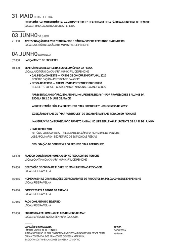 No dia 4 de junho, as comemorações terão início às 9 horas, com o lançamento de foguetes, seguindo-se um seminário às 10 horas, no Auditório da Câmara Municipal de Peniche, que incidirá sobre a Fileira Socioeconómica da Pesca e que contará com a presença do Secretário de Estado das Pescas- José Apolinário. Ainda durante a iniciativa da manhã no Auditório, haverá lugar à apresentação pública do projeto “Mar Portuguez” – conservas de Chef, seguida da exibição do filme 3D “Mar Portuguez” de Edgar Pêra, rodado em Peniche, e de uma degustação de conservas no quadro do mesmo projeto. Será também apresentado o “Projeto Animal no Life Berlengas” por professores e alunos da Escola EB 2,3, D. Luís de Ataíde e inaugurada uma exposição no âmbito desta temática, que estará patente até ao dia 19 de junho.