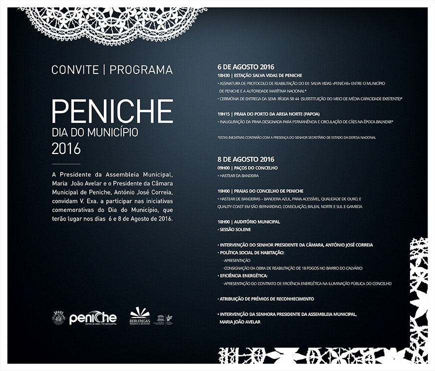 As comemorações do Dia do Município no dia 8 de agosto são marcadas por dois momentos distintos. Durante a manhã, a partir das 10h00, será concretizado um roteiro de hastear de bandeiras em diversas praias do concelho, com o objetivo de valorizar todo o investimento municipal dirigido ao reconhecimento de praias de excelência em matéria ambiental. O concelho de Peniche conquistou 7 bandeiras com a designação «Bandeira Azul», 11 «Qualidade de Ouro», 2 «Praia Acessível» e 2 «0 poluição» num território qualificado como Quality Coast, que serão hasteadas nas praias de São Bernardino, Consolação, Baleal Norte e Sul e Gamboa.