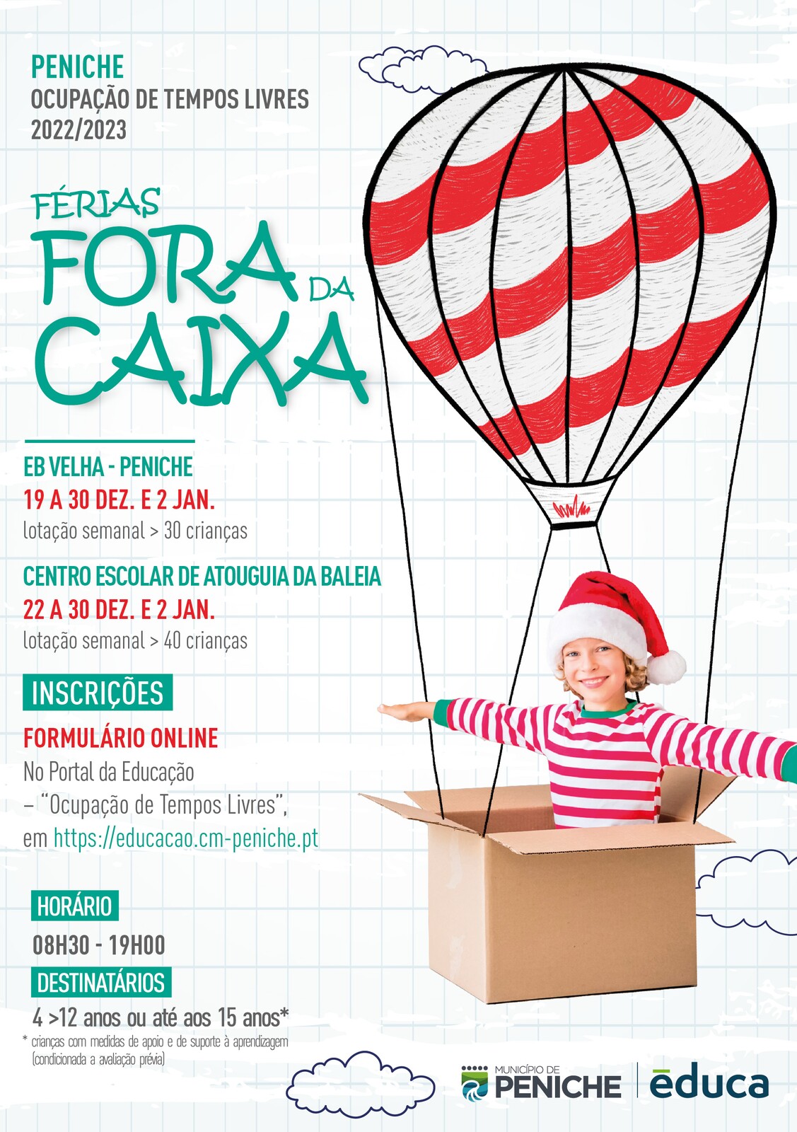 No próximo período de interrupção letiva o Serviço de OTL "Férias Fora da Caixa" decorrerá entre os dias 19 e 30 de dezembro de 2022 e no dia 2 de janeiro de 2023, na Escola Básica Velha de Peniche e no Centro Escolar de Atouguia da Baleia.