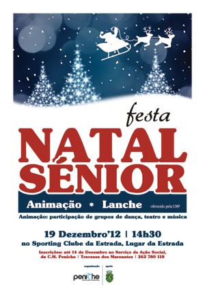 No âmbito da Promoção da Cidadania Sénior, e inserida no Plano de Ação do Grupo de Trabalho “Pessoas Idosas, Envelhecimento e Intergeracionalidade”, irá ter lugar a Festa de Natal Sénior 2012, uma organização do Município de Peniche, com a colaboração das instituições de apoio e serviços a idosos. O evento é dedicado aos munícipes seniores do nosso concelho, e decorrerá no dia 19 de dezembro (quarta-feira), pelas 14h30, no Sporting Clube da Estrada, no Lugar da Estrada.