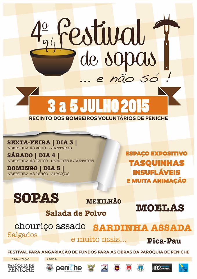 Para esta 4ª edição esperam-se cerca de 16 qualidades de sopas, que serão confecionadas pelos Grupos Paroquiais, Restaurantes e outros grupos organizados da cidade de Peniche, envolvendo toda a comunidade local num evento solidário. Além da degustação de sopas, poderá também apreciar outros sabores locais como a sardinha assada, os mexilhões e a salada de polvo, as típicas moelas, caracóis e o chouriço assado e muito mais. O festival conta ainda com animação ao longo dos três dias.