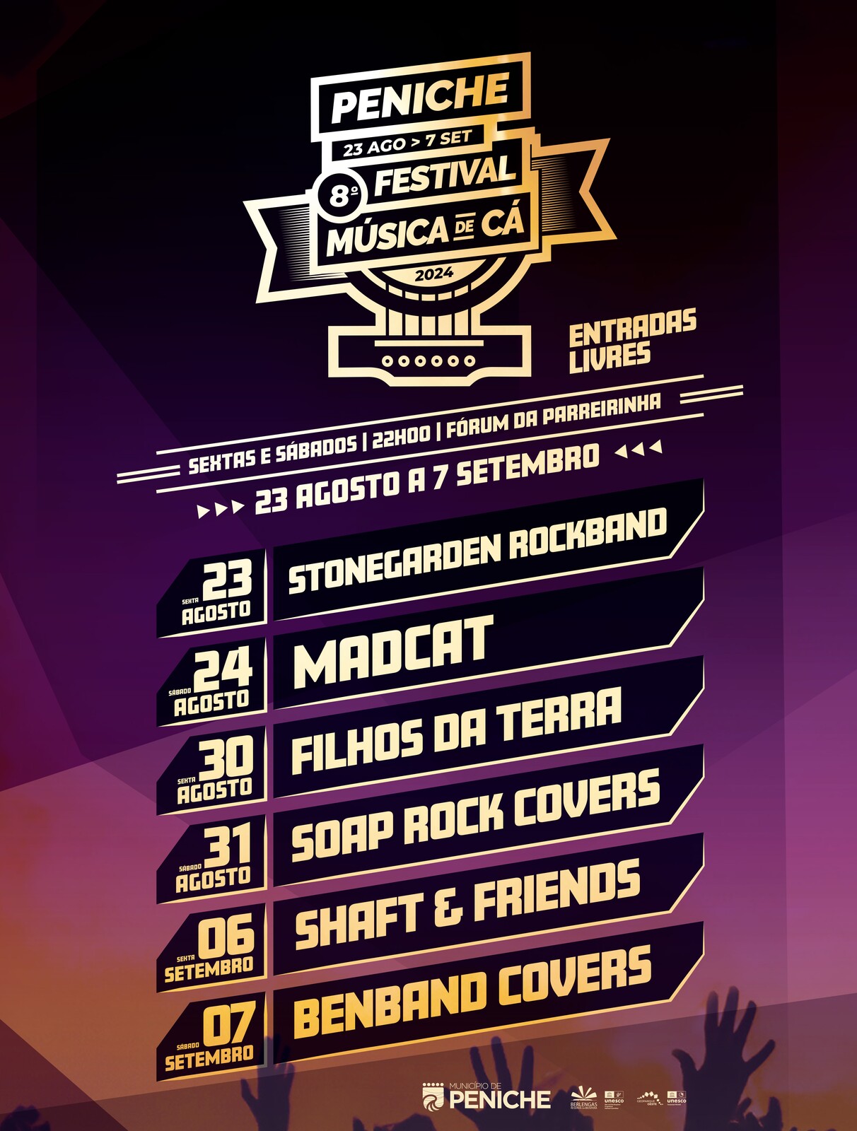 O Município de Peniche materializa neste evento a sua estratégia de trabalhar com a comunidade, como fator de desenvolvimento do território, deixando o convite a todos, locais, visitantes ou turistas para que assistam aos concertos gratuitos no Fórum da Parreirinha.