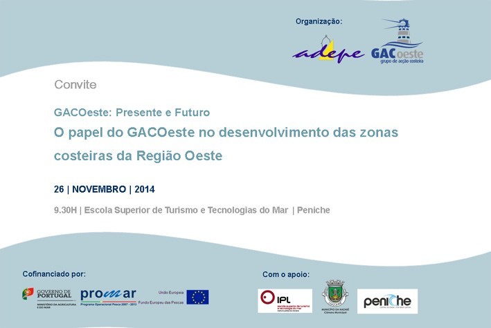 No âmbito do programa "Novembro - Mês do Mar", o Grupo de Ação Costeira do Oeste-GACOeste está a organizar um evento a realizar no dia 26 de novembro no Auditório da Escola Superior de Turismo e Tecnologias do Mar em Peniche, pelas 9h30, onde se pretende abordar o tema "O papel do GACOeste no desenvolvimento das zonas costeiras da Região Oeste" e que contará com presença de autarcas da região e promotores de projetos GACOeste.