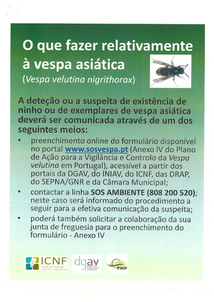 Conscientes da problemática que a Vespa velutina nigrithorax (espécie não-indígena predadora da abelha europeia, por enquanto, aparentemente circunscrita a concelhos do norte do país) pode trazer e da necessidade de controlar e monitorizar o avança dessa espécie exótica no mais curto espaço de tempo possível, a Direção Geral de Veterinária e Alimentação (DGAV), o Instituto Nacional de Investigação Agrária e Veterinária (INIAV) e o Instituto da Conservação da Natureza e das Florestas (ICNF) elaboraram, com colaboração do SEPNA/Guarda Nacional Republicana, de Câmaras Municipais e de Associações de Apicultores, o "Plano de Ação para a Vigilância e Controlo da Vespa velutina em Portugal", que se encontra disponível nos portais do ICNF (www.icnf.pt) e da DGAV (www.dgav.pt). O mesmo deverá vir a acontecer nos portais do INIAV, das Direções Regionais de Agricultura e Pescas, do SEPNA/Guarda Nacional Republicana e das Câmara Municipais.