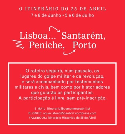 No âmbito do programa oficial das comemorações do 40º aniversário da Revolução dos Cravos, promovido pelo Governo de Portugal, terá lugar nos dias 5 e 6 julho de 2014, um itinerário de visitas por locais emblemáticos desta revolução, em Lisboa, Porto, Peniche e Santarém, com a orientação de personalidades civis, militares e historiadores.