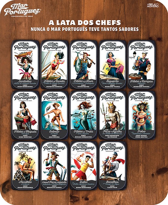 São 14 Conservas com 14 Pescados diferentes e com molhos inéditos criados por 14 conceituados Chefs Portugueses. No interior das embalagens, encontram-se 14 receitas completas que incluem estas conservas.