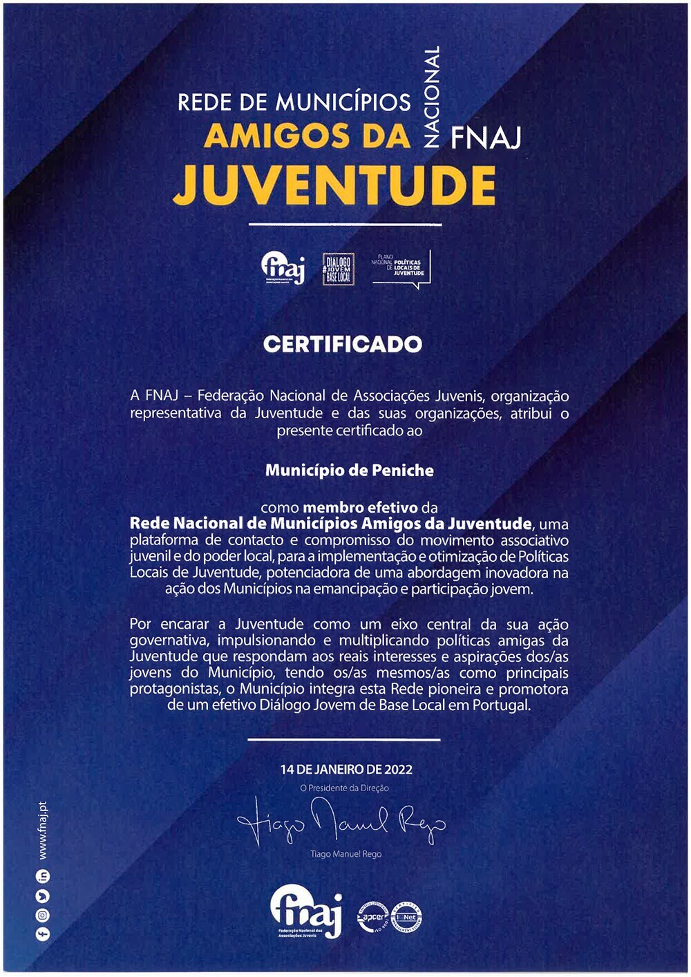 A 6 de janeiro de 2022, o Município de Peniche foi admitido como membro efetivo da Rede Nacional de Municípios Amigos da Juventude (RNMAJ).