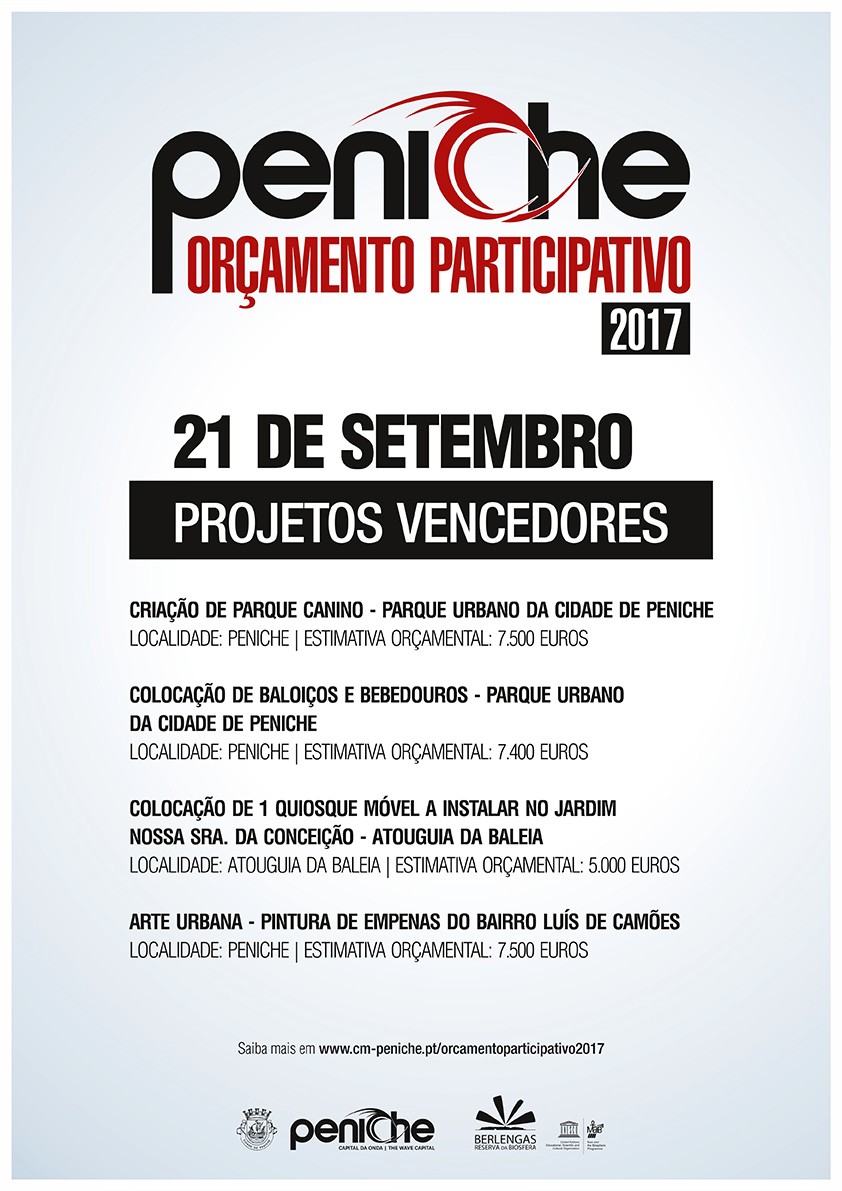 No dia 21 de setembro, às 19 horas, no Salão Nobre da Câmara Municipal de Peniche, realizar-se-á uma cerimónia com a presença dos proponentes dos projetos vencedores do Orçamento Participativo do ano 2017.