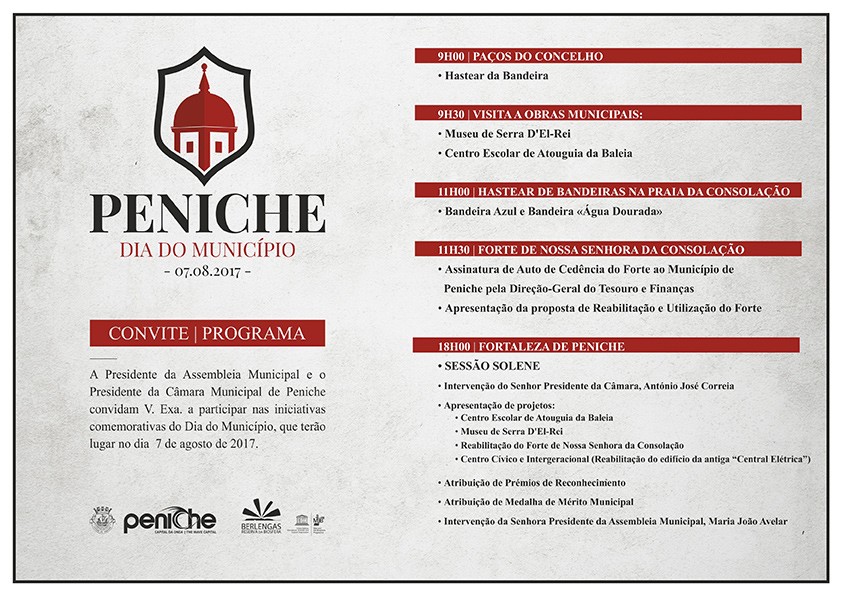 Pelas 11h30, o Forte de Nossa Senhora da Consolação será palco da cerimónia de assinatura do Auto de Cedência de Utilização e Aceitação deste Monumento Nacional, propriedade estatal, ao Município de Peniche, e no âmbito da qual será apresentado o projeto de reabilitação e utilização previsto, versando a instalação de várias valências de natureza turística e cultural.