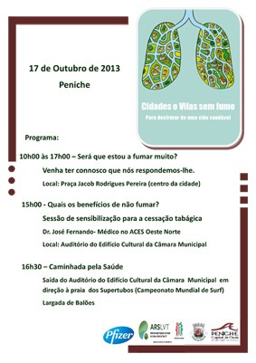 Associando-se à campanha "Cidades e Vilas Sem Fumo", o Agrupamento de Centros de Saúde do Oeste Norte e o Município de Peniche irão levar a cabo, no próximo dia 17 de Outubro, uma ação conjunta de sensibilização para os riscos do tabaco e para a cessação tabágica.