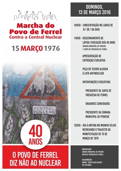 No próximo dia 13 de março de 2016, em Ferrel a partir das 10h30m a Câmara Municipal de Peniche e a Junta de Freguesia de Ferrel irão assinalar a primeira marcha popular contra a instalação de uma central nuclear em Portugal, realizada há 40 anos. Para o efeito, com a colaboração do jornal Gazeta das Caldas e da rádio 102 FM, levarão a cabo um conjunto de atividades, que incluem o descerramento de uma lápide evocativa dos 40 anos, a apresentação de uma exposição evocativa, uma peça de teatro alusiva à luta antinuclear, bem como uma ida à Antena no moinho Velho, que visa recrear o trajeto efetuado na manhã de segunda-feira, 15 de março de 1976, quando o povo de Ferrel disse «Não», levando a cabo a primeira ação expressiva contra a central nuclear que estava projetada para aquela localidade.