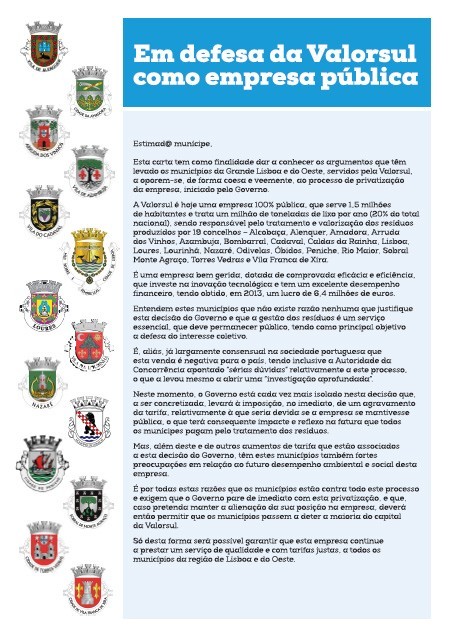 Por estas razões os municípios estão contra este processo e exigem que o governo pare de imediato com esta privatização, e se pretende manter a alienação da sua posição na empresa, então que permita aos municípios deter a maioria do capital da VALORSUL.
