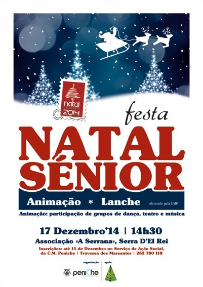 Integrado no programa do Natal Penicheiro 2014 e à semelhança de anos anteriores, a Câmara Municipal Peniche irá comemorar a quadra natalícia com a população Sénior do concelho, organizando o Natal Sénior, que irá ter lugar no dia 17 de dezembro (quarta-feira), pelas 14h30, na Associação “A Serrana”, na Serra D’El-Rei.