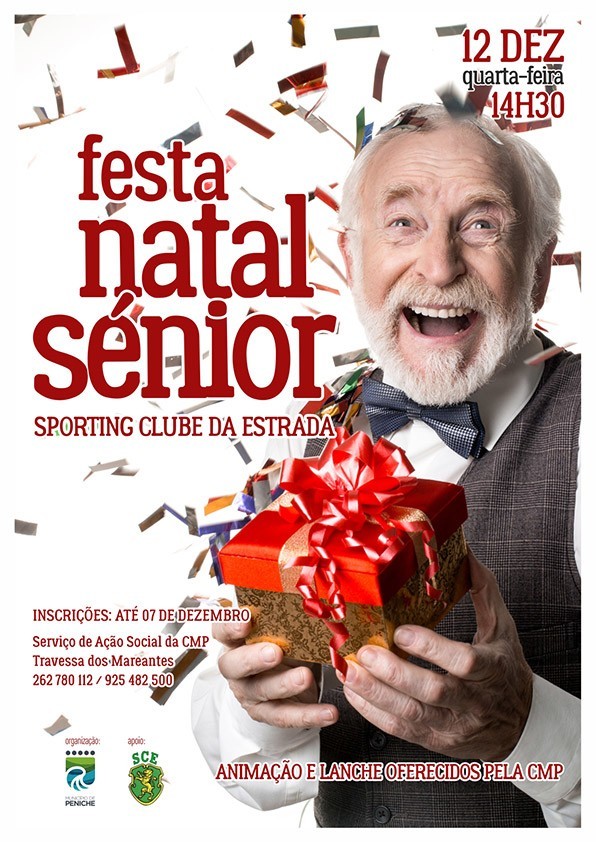 No âmbito da Promoção da Cidadania Sénior e inserida no programa “Peniche um Mar de Natal”, o Município de Peniche está a organizar a Festa de Natal Sénior, a realizar no dia 12 de dezembro (quarta-feira), pelas 14h30, no Sporting Clube da Estrada - Lugar da Estrada.