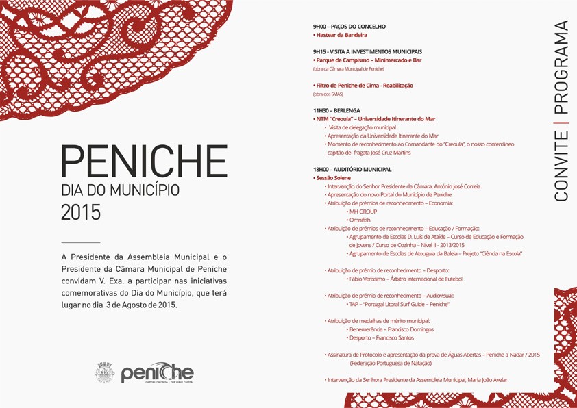 As comemorações terão início às 9 horas, com o hastear da bandeira, seguindo-se uma visita a Investimentos Municipais, nomeadamente ao Minimercado e Bar do Parque de Campismo Municipal, cuja obra esteve a cargo da Câmara Municipal de Peniche e ao Reservatório do Filtro de Peniche de Cima, cuja reabilitação foi promovida pelos Serviços Municipalizados de Peniche. Beneficiando de uma localização privilegiada na entrada da cidade, em Peniche de Cima, o Reservatório de água foi construído em 1931 e destinou-se a apoiar a primeira rede de abastecimento domiciliário de água em Peniche.