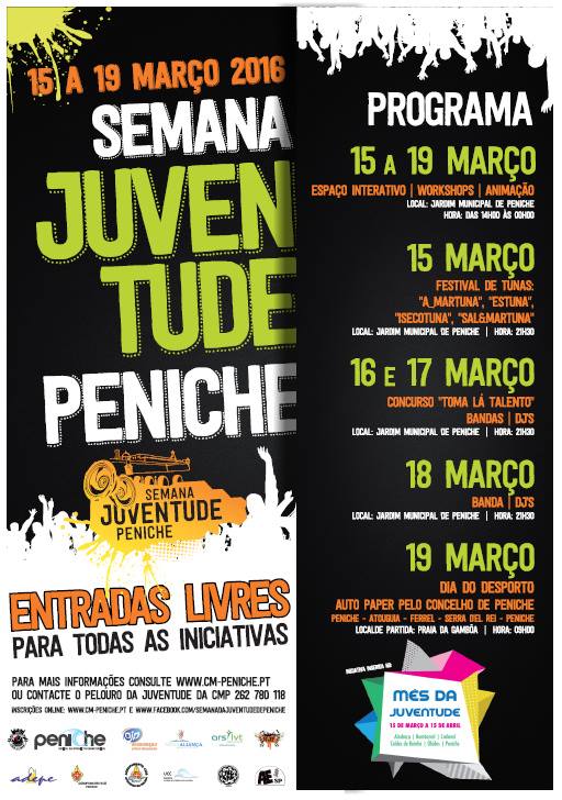 A XI edição da Semana da Juventude vai decorrer, em Peniche, entre os dias 15 e 19 de março de 2016, no Jardim Municipal de Peniche. Este ano, integra, também, atividades do Mês da Juventude do Oeste 15/15 (de 15 de março a 15 de abril), em que estão envolvidos os municípios de Alcobaça, Bombarral, Cadaval, Caldas da Rainha, Óbidos e Peniche.
