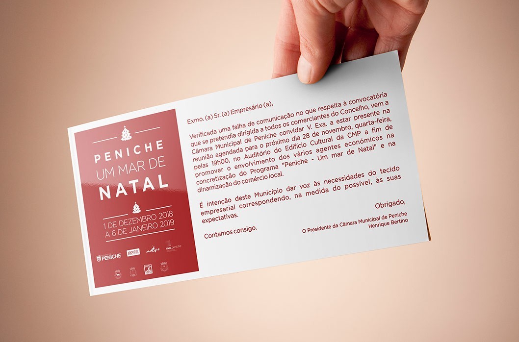 Exmo. (a) Sr. (a) Empresário (a), Verificada uma falha de comunicação no que respeita à convocatória que se pretendia dirigida a todos os comerciantes do Concelho, vem a Câmara Municipal de Peniche convidar V. Exa. a estar presente na reunião agendada para o próximo dia 28 de novembro, quarta-feira, pelas 19h00, no Auditório do Edifício Cultural da CMP a fim de promover o envolvimento dos vários agentes económicos na concretização do Programa "Peniche - Um mar de Natal" e na dinamização do comércio local.