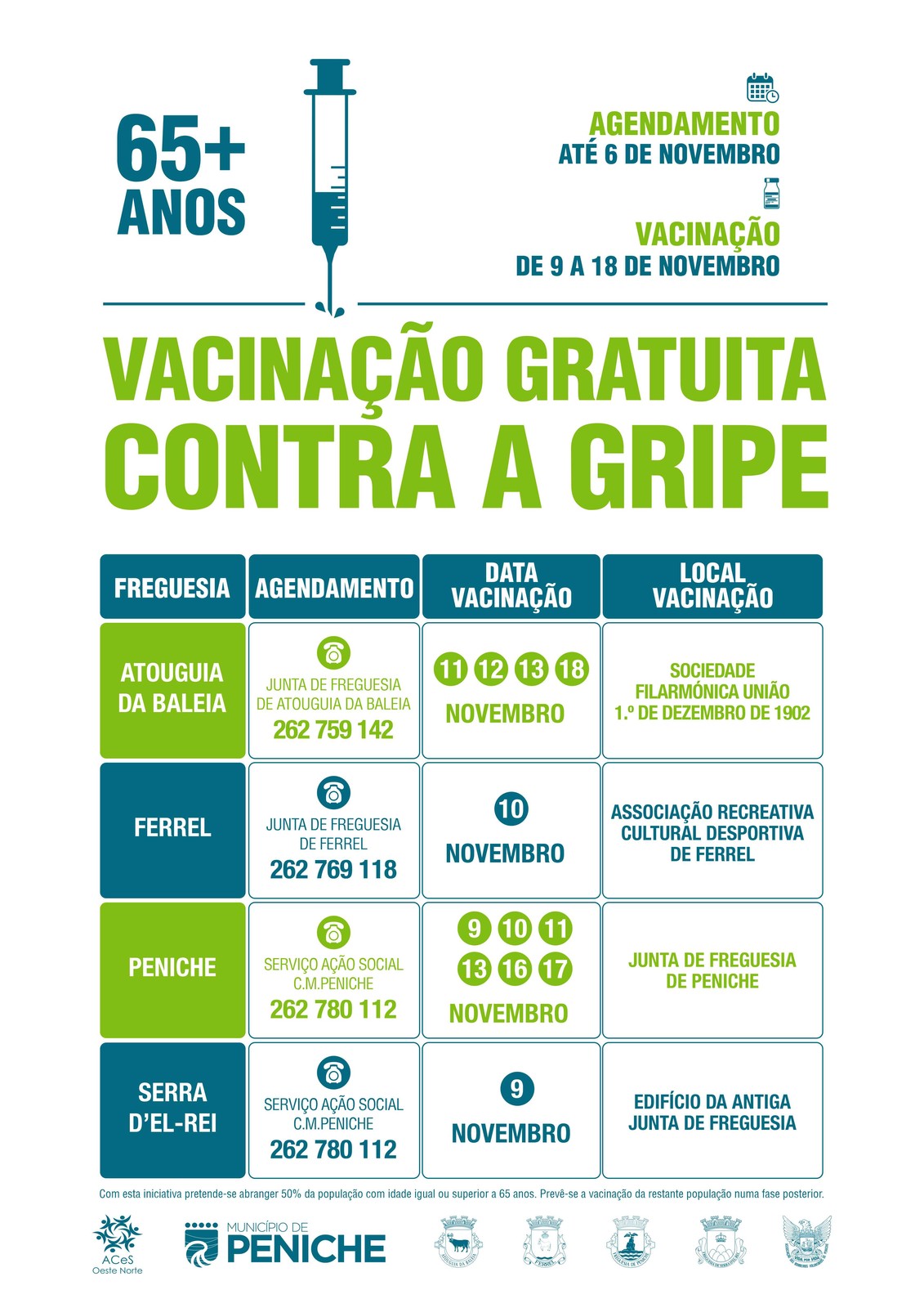 O Município de Peniche e as Juntas de Freguesia de Atouguia da Baleia, Ferrel, Peniche e Serra d’El-Rei associaram-se ao Agrupamento de Centros de Saúde (ACeS) Oeste Norte na campanha de vacinação gratuita para cidadãos com idade igual ou superior a 65 anos do concelho de Peniche. A campanha irá decorrer de 9 a 18 de novembro nas localidades sede de freguesia.