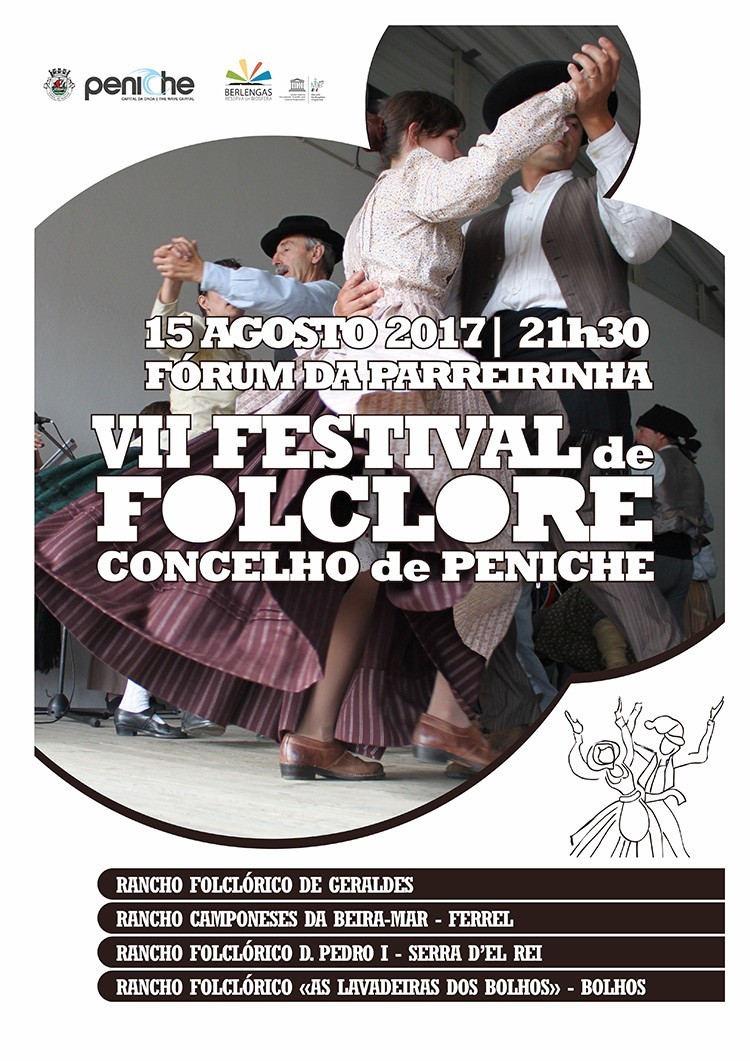 A Câmara Municipal de Peniche tem a honra de convidar V. Exa. para o VII Festival de Folclore do Concelho de Peniche, a realizar no próximo dia 15 de agosto, pelas 21h30, no Fórum da Parreirinha. Este evento contará com a participação do Rancho Folclórico de Geraldes; do Rancho Folclórico "Os Camponeses da Beira Mar" - Ferrel; do Rancho Folclórico "D. Pedro I" - Serra D'El Rei e do Rancho Folclórico "As Lavadeiras dos Bolhos" - Bolhos.