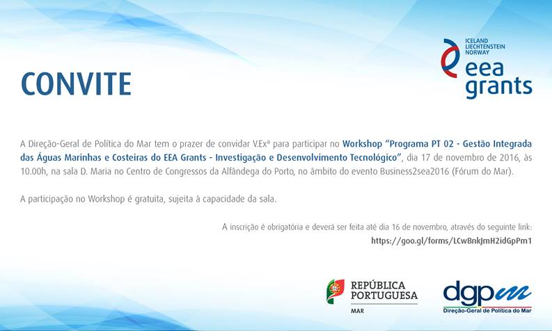 Workshop subordinado ao tema "PT 02 - Programa Gestão integrada das Águas Marinhas e Costeiras do EEA Grants - Investigação e Desenvolvimento Tecnológico", dia 17 de novembro às 10.00h, no decurso do Business2Sea 2016.