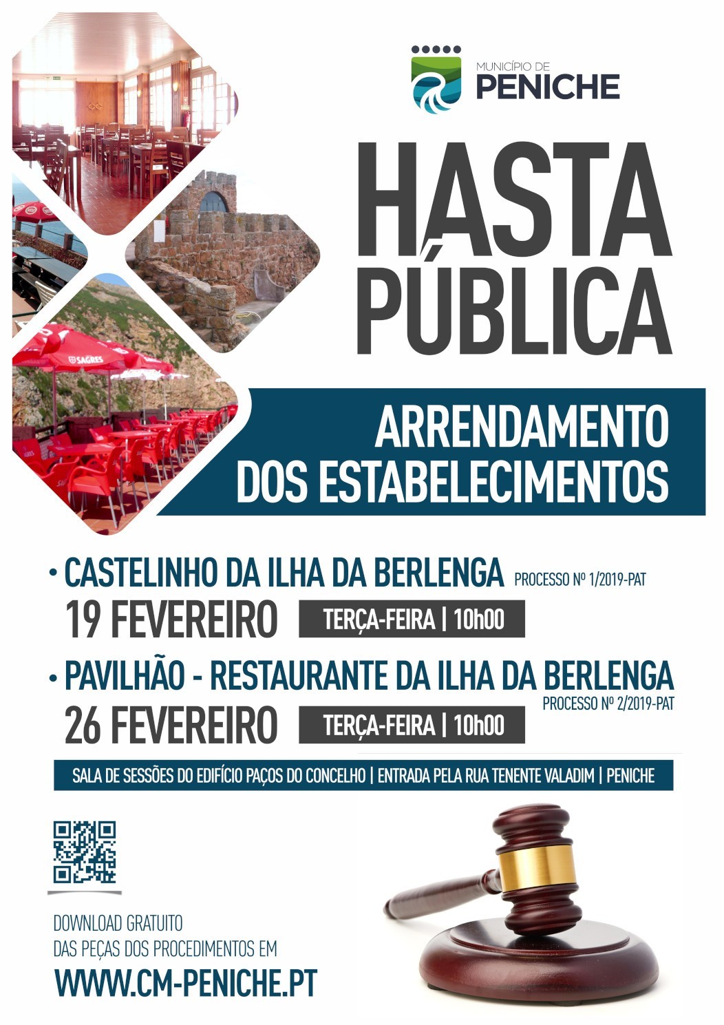 Com data de 22 de janeiro, foi publicado o Edital nº 11/2019 relativo ao Arrendamento do Estabelecimento “Castelinho da Ilha da Berlenga” em Peniche, conforme deliberação da Câmara Municipal de Peniche na sua reunião ordinária realizada em 21 de janeiro de 2019.