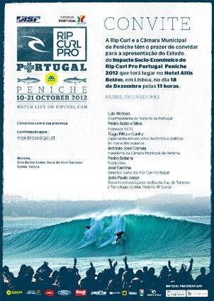 A Rip Curl e a Câmara Municipal de Peniche têm o prazer de convidar para a apresentação do Estudo do Impacto Socio-Económico do Rip Curl Pro Portugal Peniche 2012 que terá lugar no hotel Altis Belém, em Lisboa, no dia 18 de Dezembro pelas 11 horas.