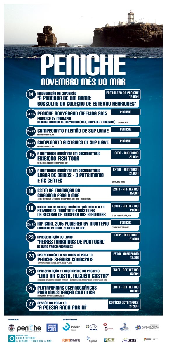 Numa organização conjunta da Câmara Municipal de Peniche, do Peniche Surfing Clube e da Escola Superior de Turismo e Tecnologia do Mar – Politécnico de Leiria, novembro – mês do mar 2015 incluirá um conjunto diverso de eventos que abordarão a Cultura, o Desporto, a Economia, a Educação, a Investigação e a Sensibilização Ambiental.