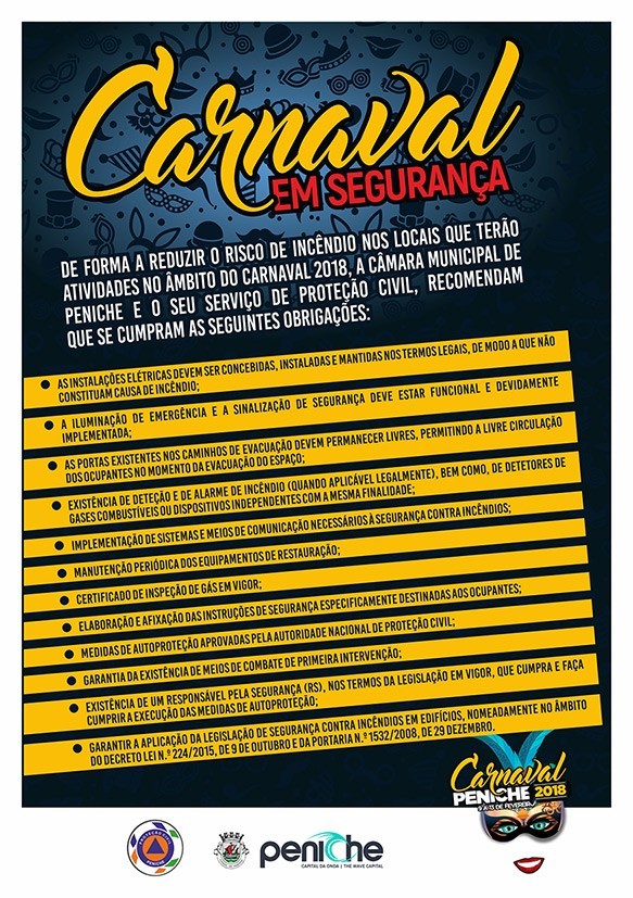 De forma a reduzir o risco de incêndio nos locais que terão atividades no âmbito do carnaval 2018, a Câmara Municipal de Peniche e o seu serviço de Proteção Civil, recomendam que se cumpram as seguintes obrigações: