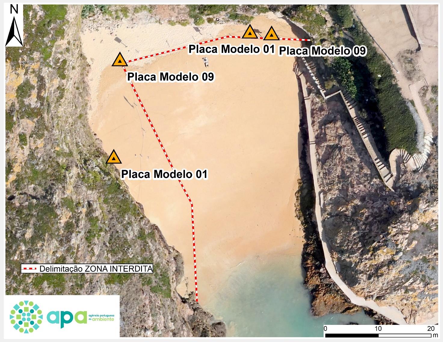 2. Assim, no local, ao nível da base da arriba, serão colocadas duas placas de interdição Modelo 09 e uma placa Modelo 01, nos termos da Portaria n.º 241/2013, de 29 de julho, de modo a sinalizar a área de interdição (conforme figura em anexo), que não oferece as necessárias condições de segurança face à instabilidade da vertente e risco para os utentes.