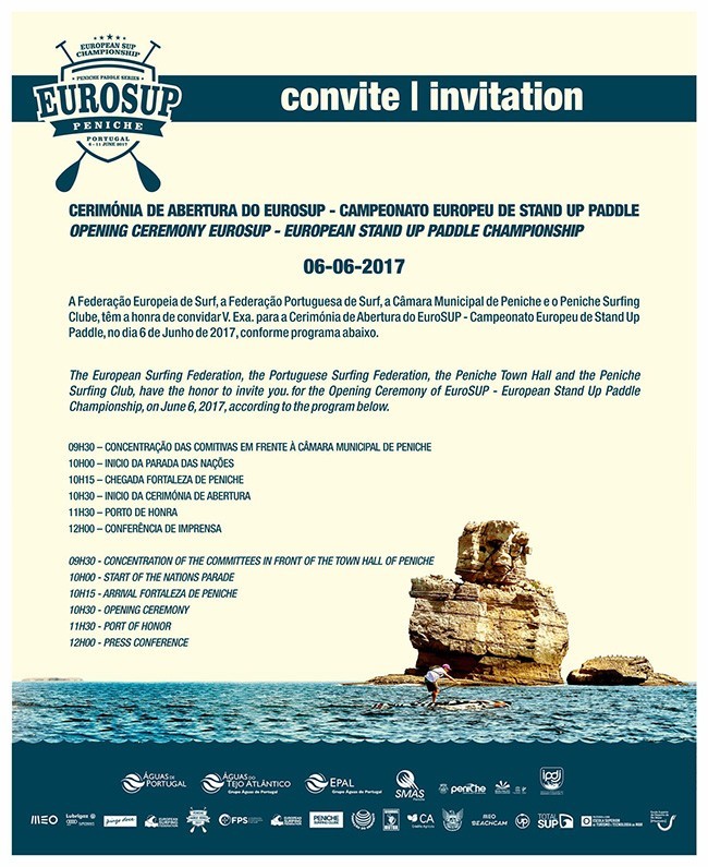 A Federação Europeia de Surf, a Federação Portuguesa de Surf, a Câmara Municipal de Peniche e o Peniche Surfing Clube, têm a honra de convidar V. Exa. para a Cerimónia de Abertura do EuroSUP - Campeonato Europeu de Stand Up Paddle, no dia 6 de Junho de 2017, conforme programa: