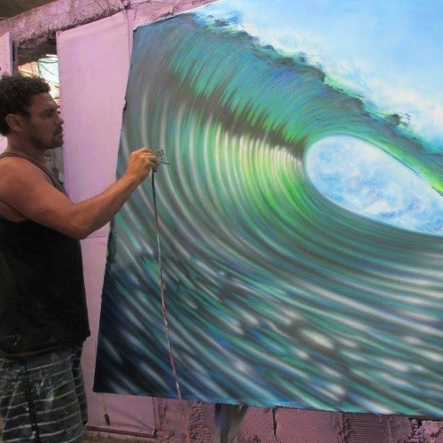 Wilson Alexandre is a Brazilian artist, born and raised in Rio de Janeiro, Brazil, where he lived and worked until he moved to Peniche in June 2016. Self-taught artist and surfer, his passion for the sea, nature and vibrant colors is evident in their artwork. One of the artistic activities that Wilson loves to produce is large murals, using airbrush and spray, particularly sea waves, creating an "art" that represents the nature of the local area. Being the great murals with waves one of its trademarks had here a privileged place to share their creativity with other lovers of the sea, local population and visitors.