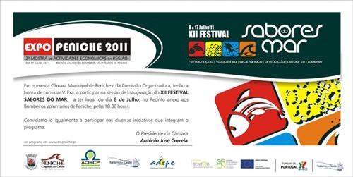 Em nome da Câmara Municipal de Peniche e da Comissão Organizadora, tenho a honra de convidar V. Exa. a participar na sessão de Inauguração do XII FESTIVAL SABORES DO MAR, a ter lugar no dia 8 de Julho, no Recinto anexo aos Bombeiros Voluntários de Peniche, pelas 18.00 horas.