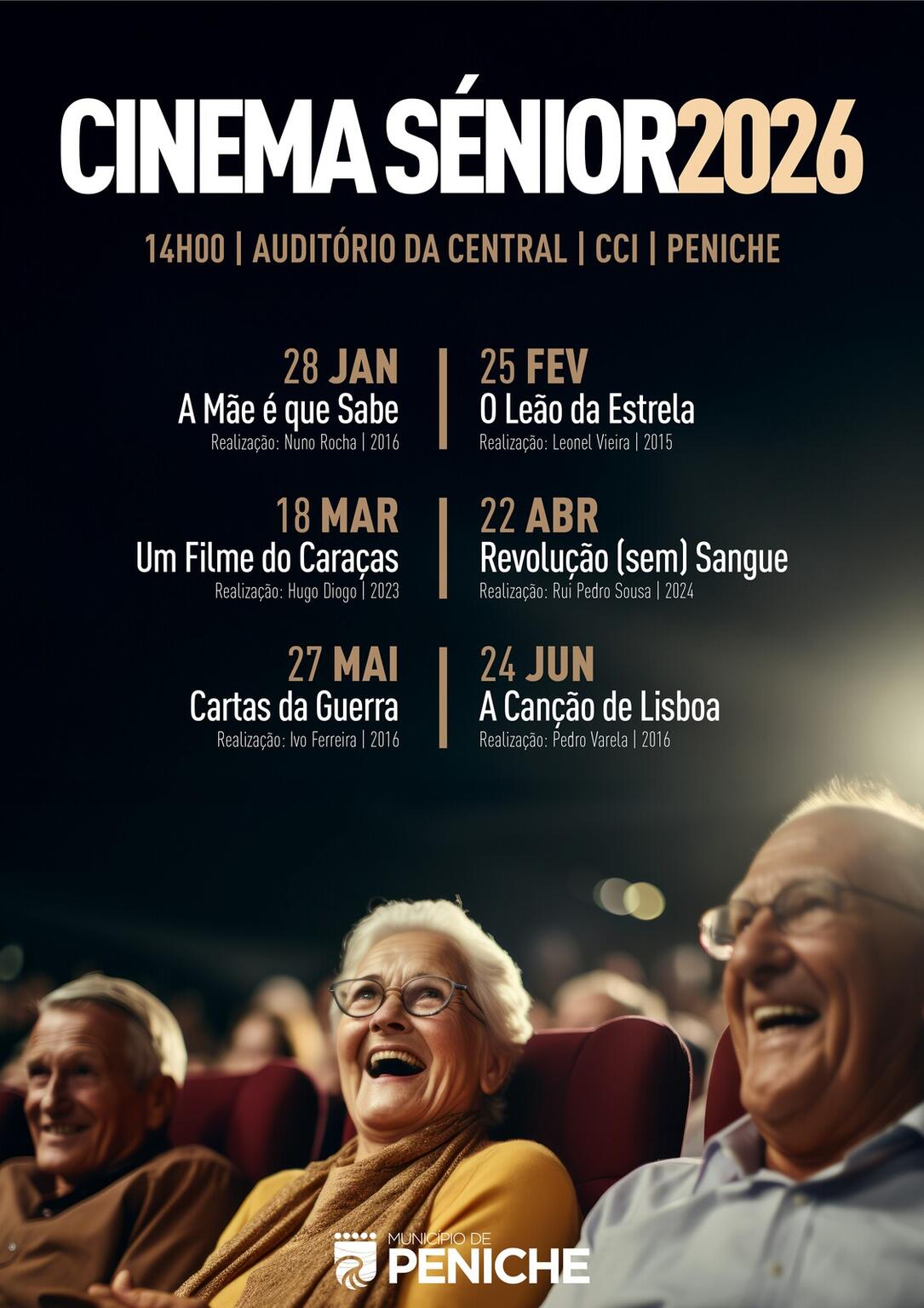 Adicionar a calendário2026-01-28 14:00:002026-06-24 16:00:00Europe/LisbonCinema Sénior no Auditório da Central Elétrica - CCI | Peniche 2026Auditório do Centro Cívico Intergeracional Professor Rogério Cação