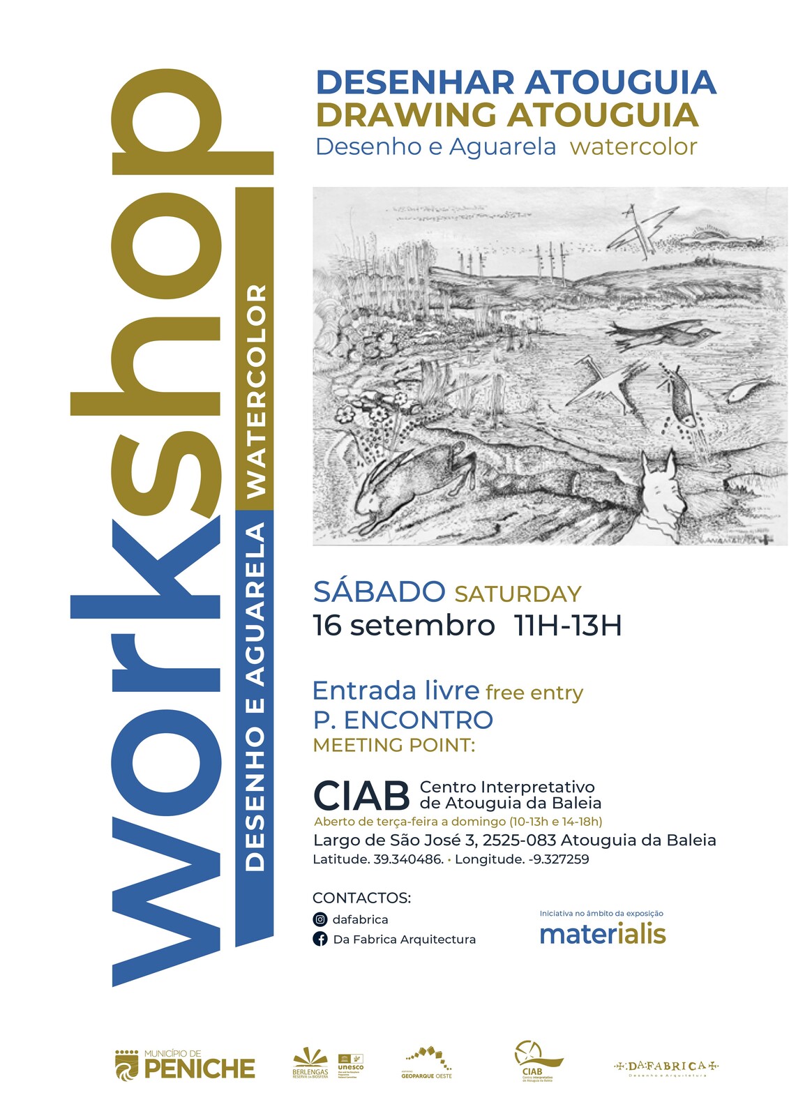 Adicionar a calendário2023-09-16 11:00:002023-09-16 13:00:00Europe/Lisbon"Desenhar Atouguia" - Workshop de desenho e aguarelaNo âmbito da exposição "materialis", estão a ser promovidas várias iniciativas culturais abertas a diversas faixas etárias.CIAB – Centro Interpretativo de Atouguia da Baleia