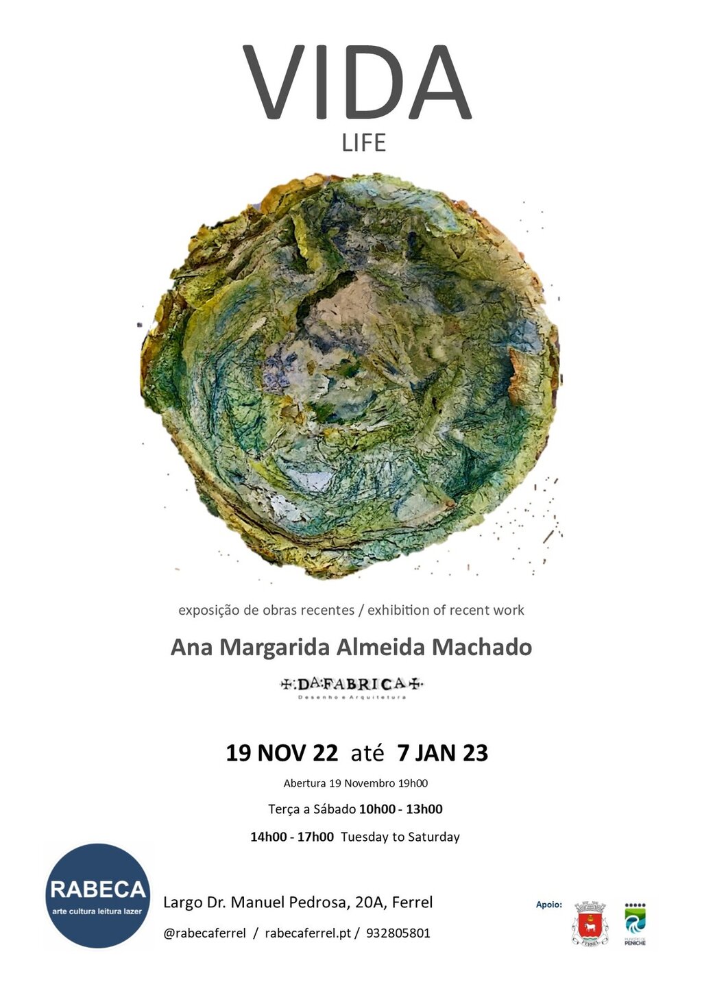 Adicionar a calendário2022-11-19 19:00:002023-01-07 17:00:00Europe/LisbonExposição "VIDA" de Ana Margarida Almeida MachadoAssociação RABECA - Largo Dr. Manuel Pedrosa, 20A, FerrelAssociação RABECA