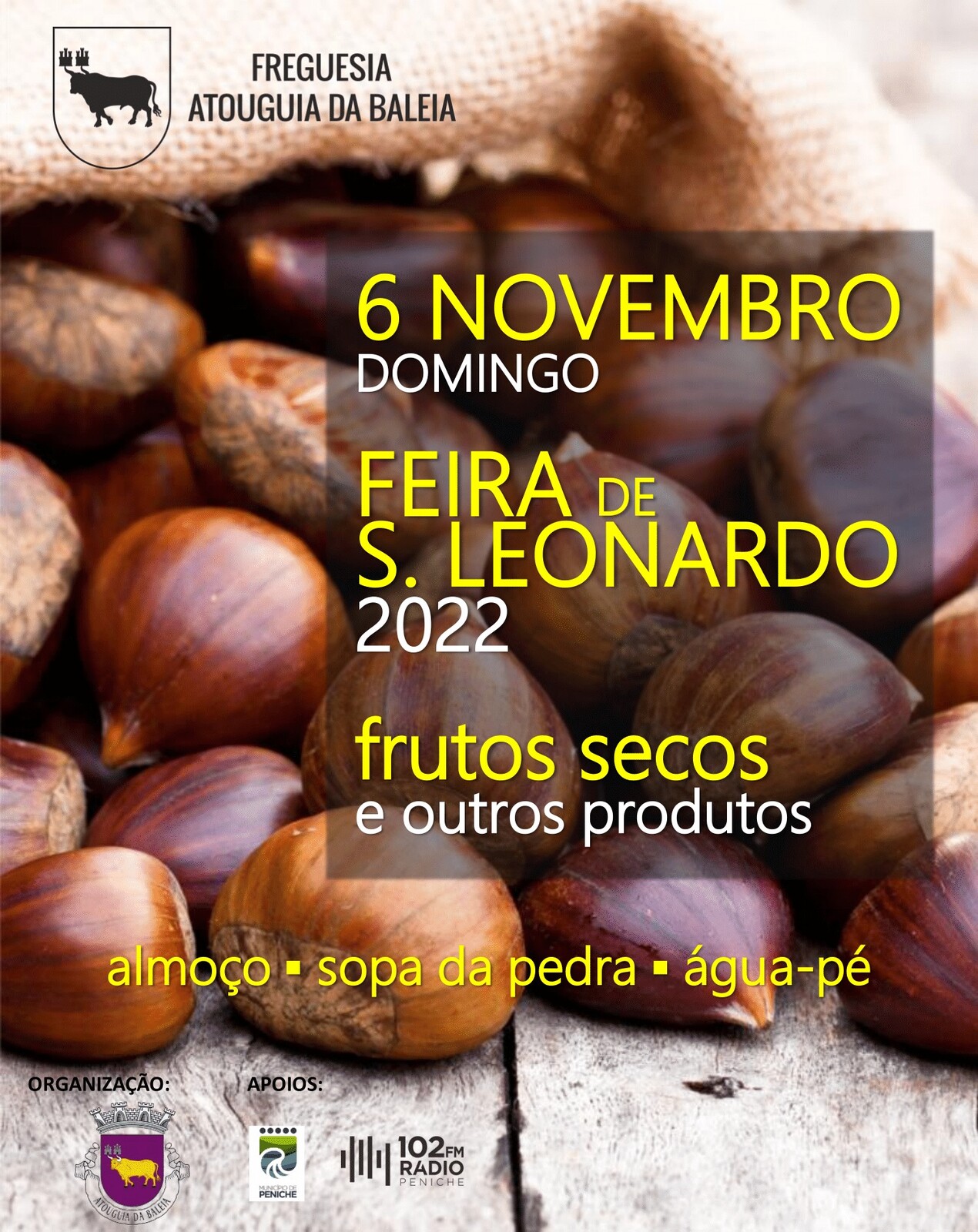 Adicionar a calendário2022-11-06 09:00:002022-11-06 18:00:00Europe/LisbonFeira de São LeonardoNo próximo domingo, dia 6, venha até à vila de Atouguia da Baleia para a feira dos frutos secos!Atouguia da BaleiaJunta de Freguesia de Atouguia da Baleia