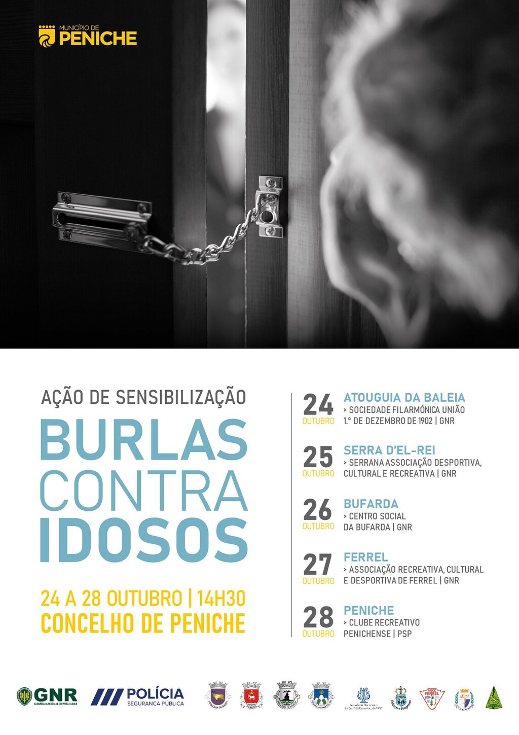 Adicionar a calendário2022-10-24 14:30:002022-10-28 17:00:00Europe/LisbonAção de Sensibilização "Burlas Contra Idosos"Ação de Sensibilização "Burlas Contra Idosos", promovida pela GNR e PSP, em colaboração com a Câmara Municipal de Peniche, Juntas de Freguesia e Associações Locais.Evento