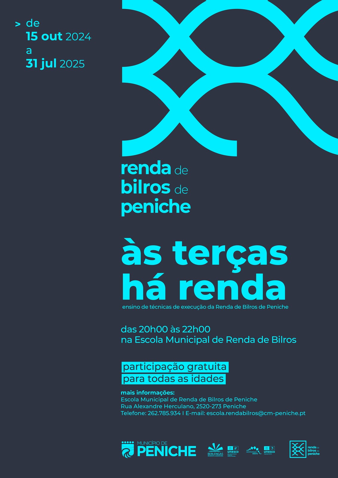 Para mais informações contactar a Escola Municipal de Renda de Bilros de Peniche pelo telefone 262 785 934 ou através do email escola.rendabilros@cm-peniche.pt.