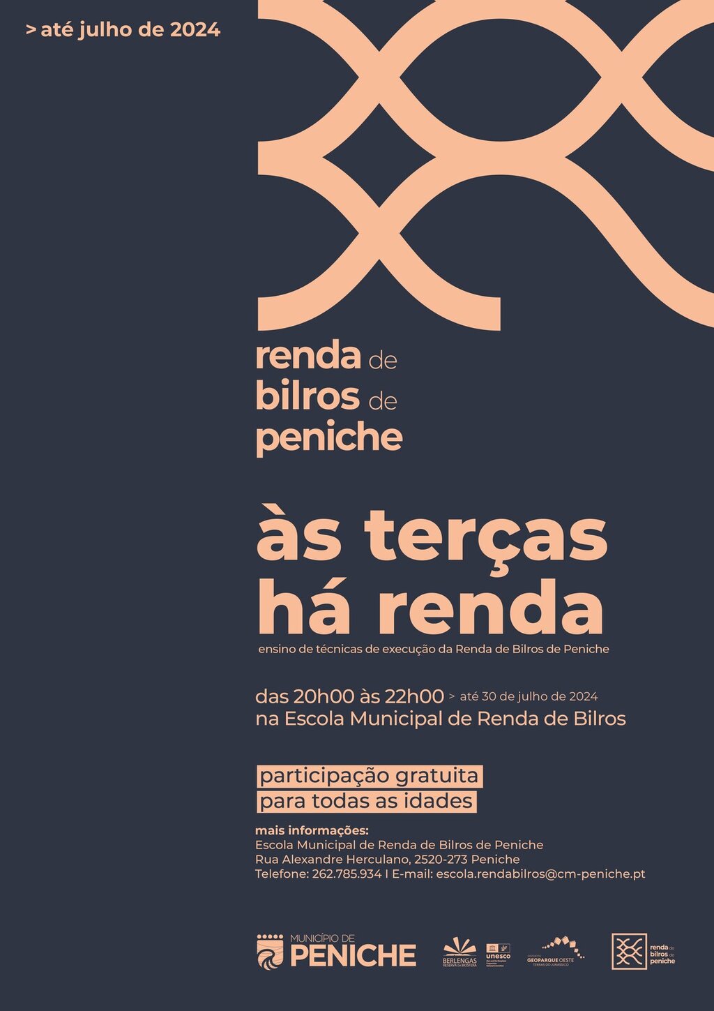 Para mais informações contactar a Escola Municipal de Renda de Bilros de Peniche pelo telefone 262 785 934 ou através do email escola.rendabilros@cm-peniche.pt