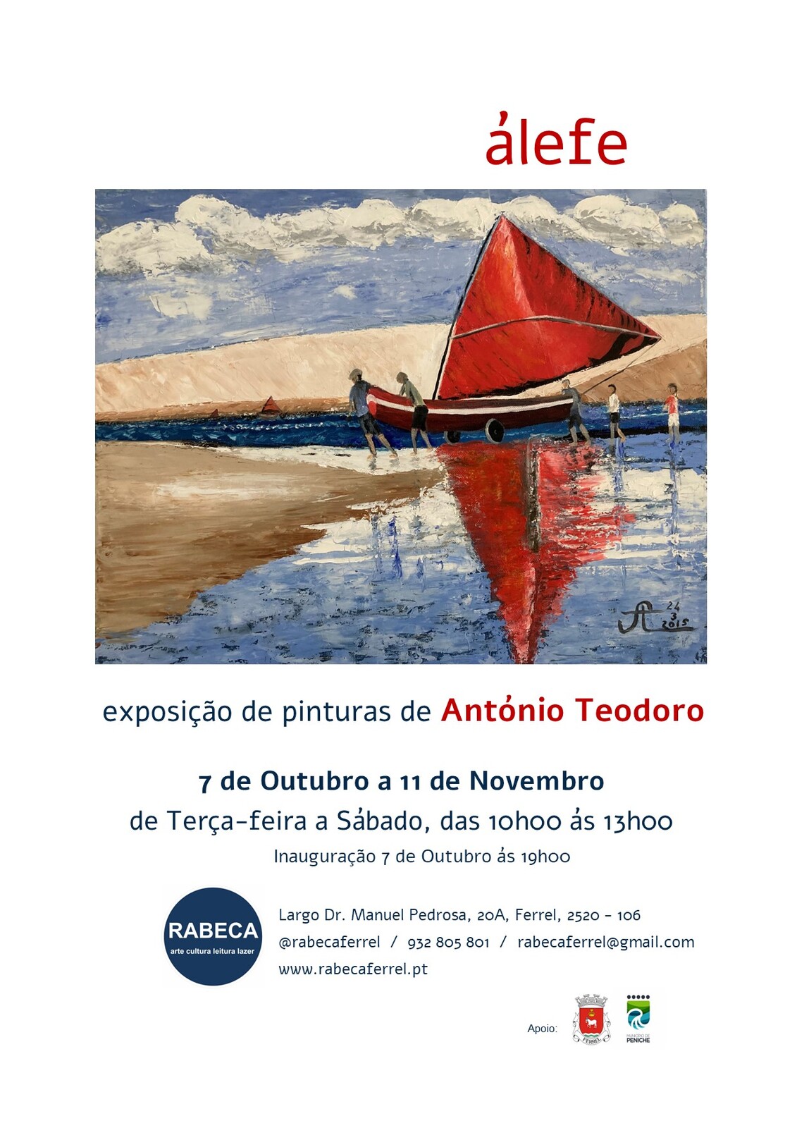 Adicionar a calendário2022-10-07 19:00:002022-11-11 13:00:00Europe/LisbonExposição "Álefe", pinturas de António TeodoroInauguração: Sexta-feira, 7 de outubro de 2022 | 19h00Associação RABECA - Largo Dr. Manuel Pedrosa, 20A, FerrelAssociação RABECA