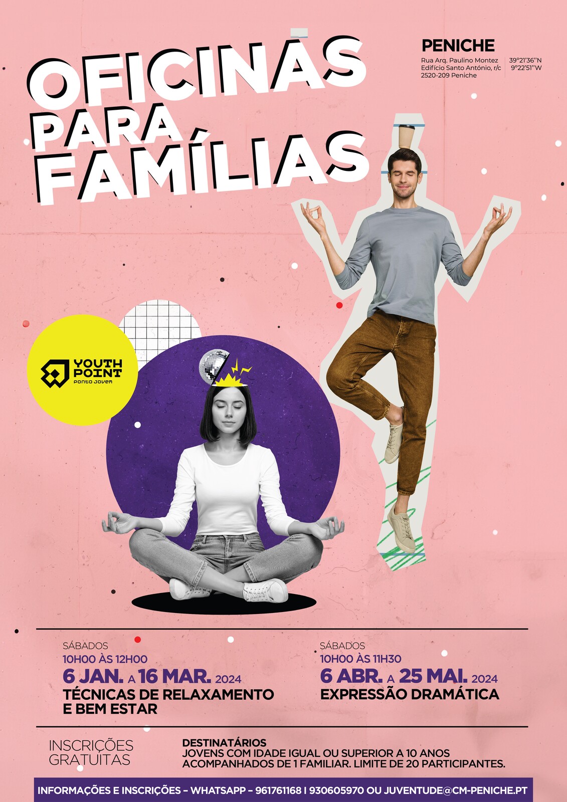 Adicionar a calendário2024-01-06 10:00:002024-05-25 11:30:00Europe/LisbonOficinas para Famílias | Oficina de Técnicas de Relaxamento e Bem Estar e Oficina de Expressão DramáticaYouth Point – Ponto Jovem do Município de Peniche